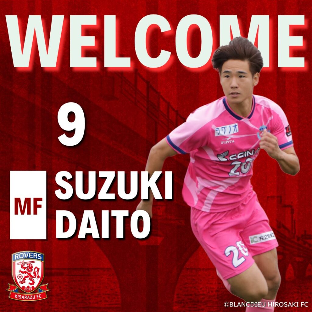この度、房総ローヴァーズ木更津FCでは、ブランデュー弘前FC(東北社会人サッカーリーグ1部)に所属しておりました鈴木 大登選手が加入しましたのでお知らせいたします。 鈴木 大登(SUZUKI DAITO)